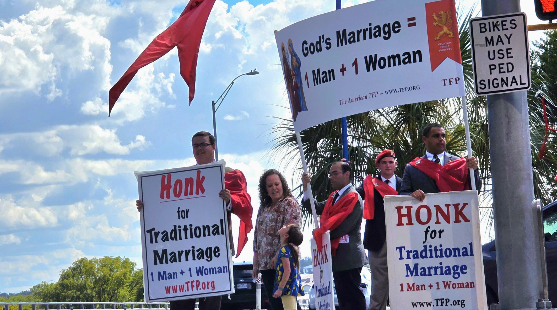 The afternoon sun beat down relentlessly on the busy intersection. Above the din of car horns and semi-truck engines, the sound of bagpipes and singing drifted on the breeze. A group of 17 young men, gathered under an American flag, held signs which stated, “God’s Marriage = 1 man + 1 woman.”